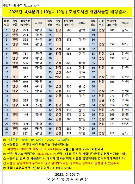 2025년 4/4분기(10~12월) 초평도서관 개인사물함 배정결과