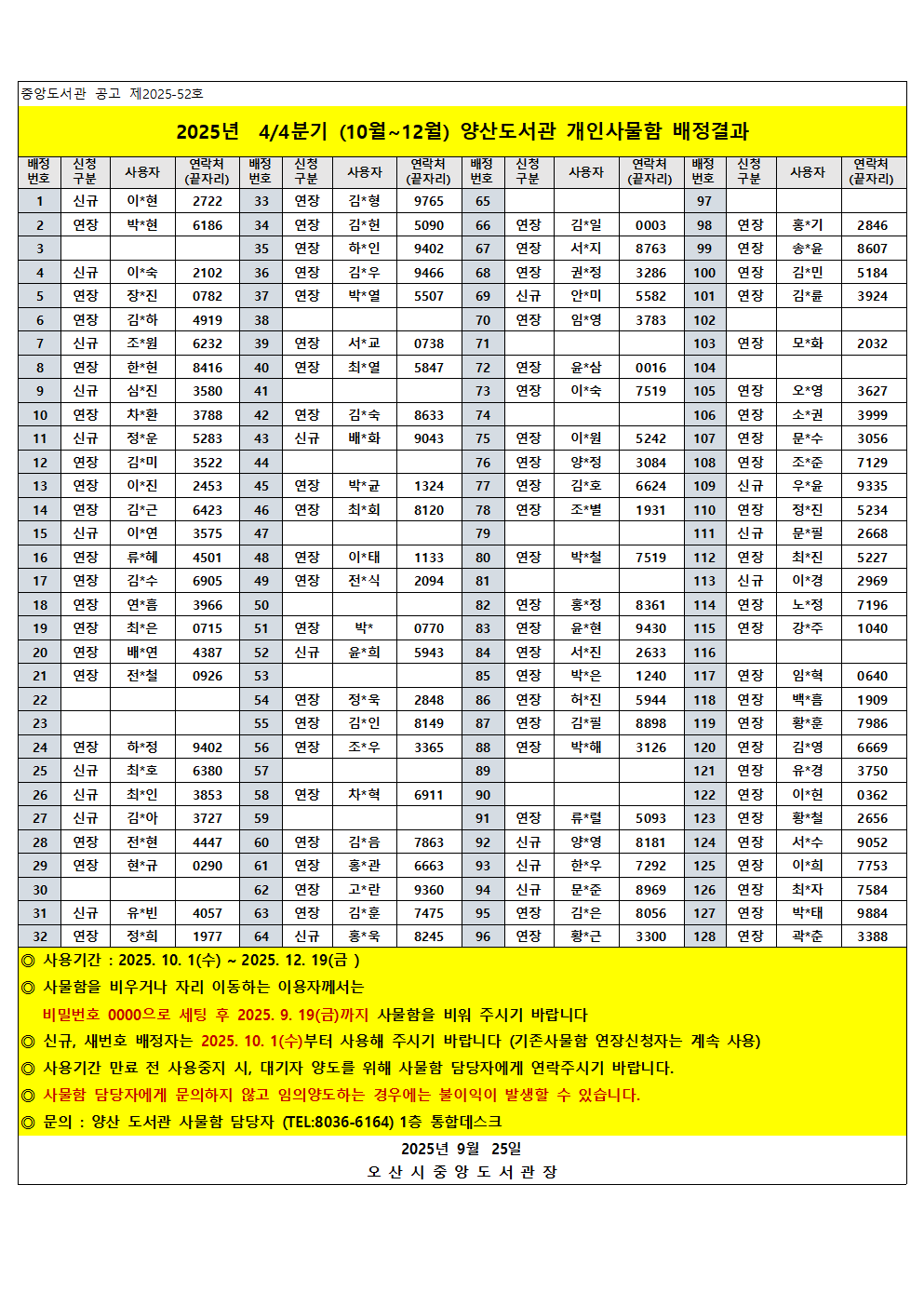 2025년 4/4분기 (10~12월) 양산도서관 개인사물함 배정공고